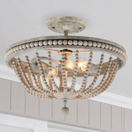 This 2-light semi-flush mount fixture, from the Kayla collection, features a beautifully hand painted mystic sand finish that will complement many transitional decors throughout your home. Adorned with strings of hand-painted wood beads, this charming semi-flush light fixture in mystic sand finish brings coastal and bohemian flair to your space. This ceiling light evokes sea shells and sand dunes while washing the space below in beautiful ambient lighting. Try it in a stairway landing, guest room, hallway or any space with a low ceiling.
