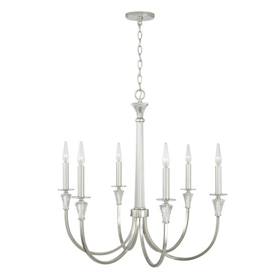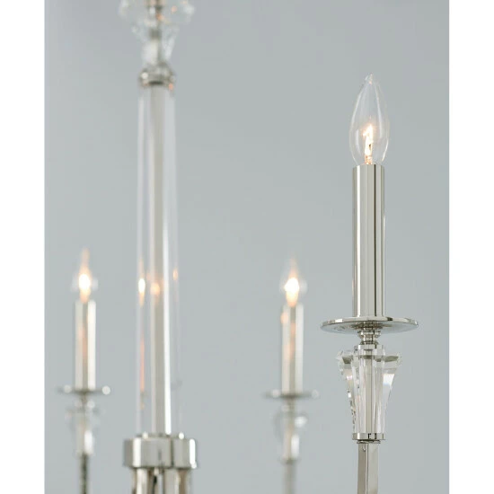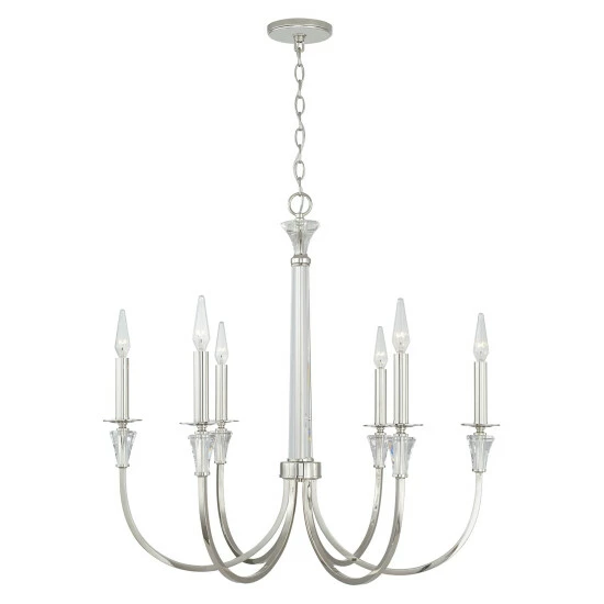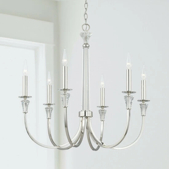 High-fashion meets high-shine with the Laurent collection 6-light chandelier. The classic curves, crystal accents and reflective Polished Nickel finish give any space the look of runway glamour.