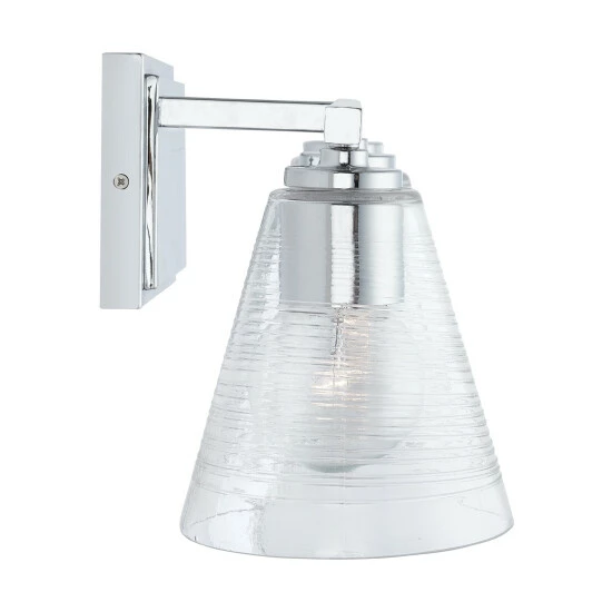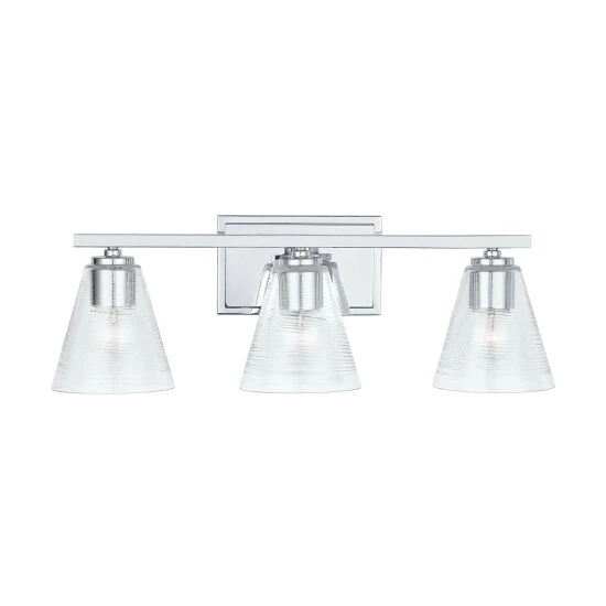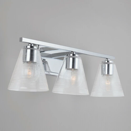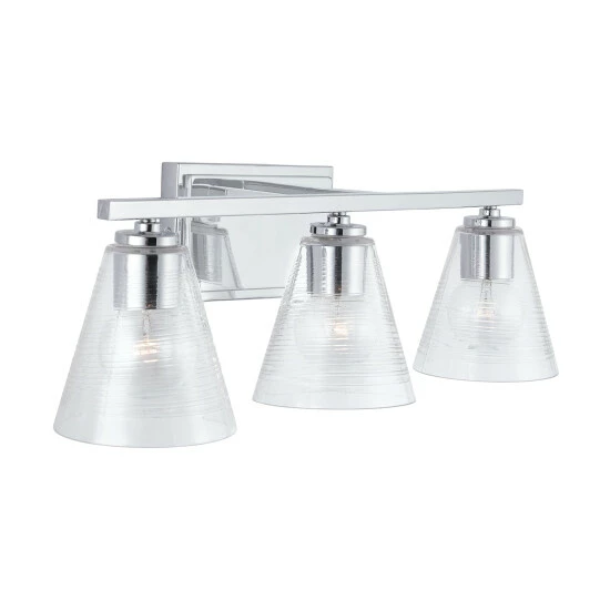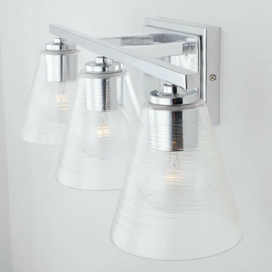 The cone-shaped glass on this 3-light bath/ vanity fixture has a raised glass spiral texture on the exterior of the material, creating a unique texture and sparkle that is further emphasized by the Chrome finish.