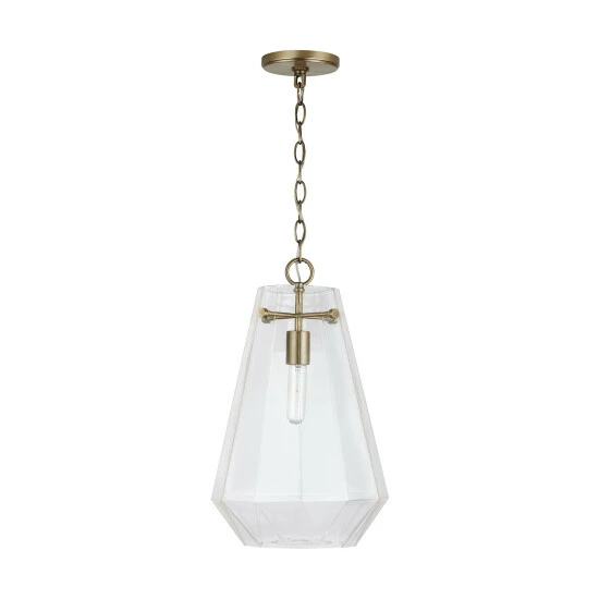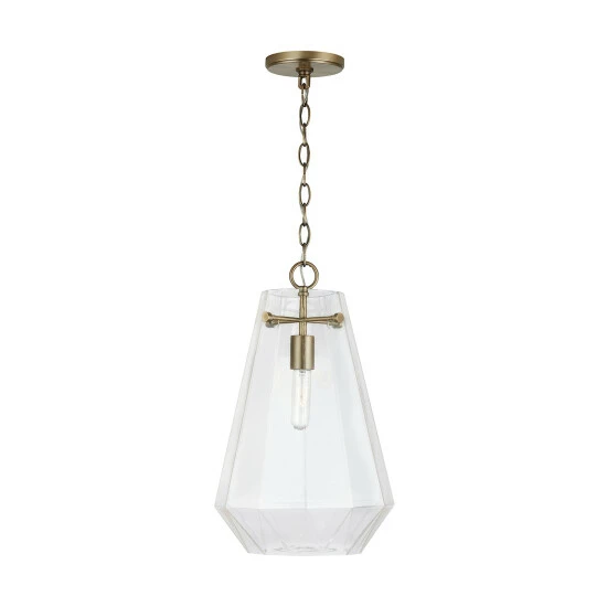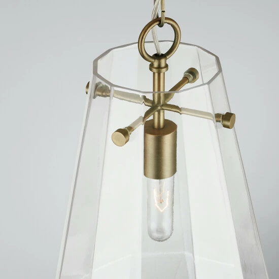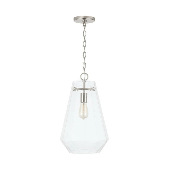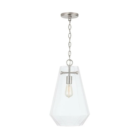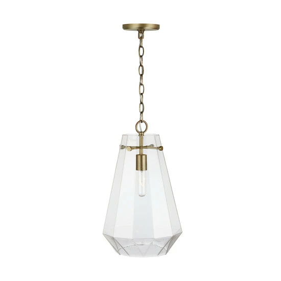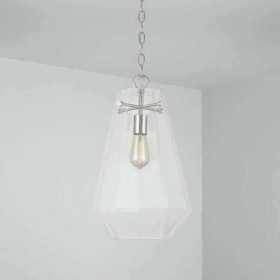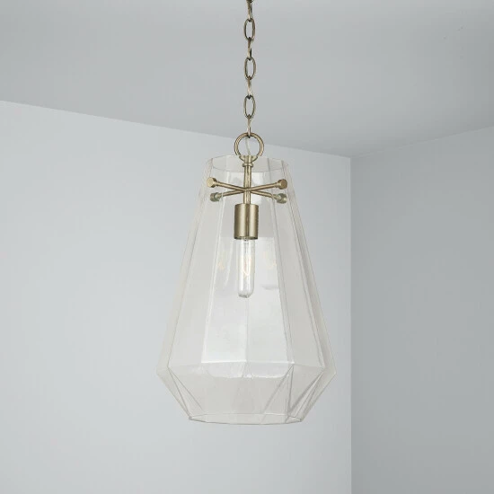 The crystal-inspired prismatic shape of this single glass pendant sparkles and creates a dramatic design moment without being too visually dominant in a space.