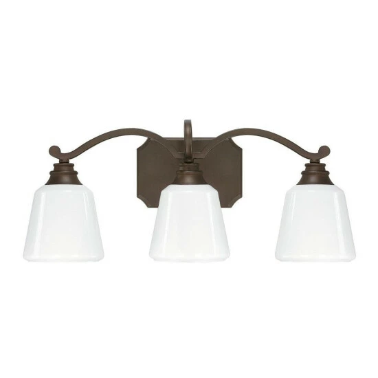 This Leigh collection 3-light bath/vanity light features a beautiful hand painted burnished bronze finish that will complement many transitional decors. The opal glass shades soften the light and complete the look of this piece. Capital Lighting is a family owned business just outside Atlanta, Georgia. We pride ourselves by delivering high quality products at affordable pricing. Beginning with design concepts from popular home fashions, we transform our ideas into lighting fixtures that blend timeless beauty with today’s styling. From casting and forging to the hand painted finishes and fine details we strive to make our products the finest in the industry. Dimensions: 9.5 inches high x 22.58 inches wide x 6.5 inches deep.