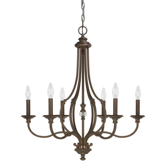 This Leigh collection 6-light chandelier features a beautiful hand painted burnished bronze finish that will complement many transitional decors. The glass ball in the center column adds interest to this simple but elegant design. Capital Lighting is a family owned business just outside Atlanta, Georgia. We pride ourselves by delivering high quality products at affordable pricing. Beginning with design concepts from popular home fashions, we transform our ideas into lighting fixtures that blend timeless beauty with today’s styling. From casting and forging to the hand painted finishes and fine details we strive to make our products the finest in the industry. This piece includes 96 inches of chain and 120 inches of wire. Dimensions: 30.375 inches high x 26.25 inch diameter.