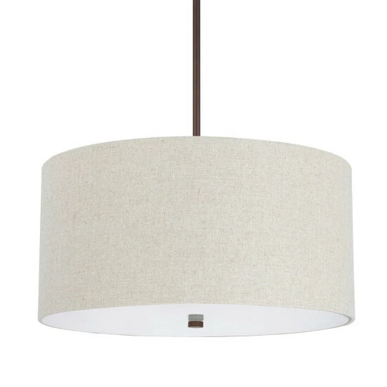 This Loft collection 4-light pendant features a beautiful hand painted burnished bronze finish that will complement many classic and traditional decors. The light tan fabric shade and frosted glass diffuser softens the light and completes the look. Capital Lighting is a family owned business just outside Atlanta, Georgia. We pride ourselves by delivering high quality products at affordable pricing. Beginning with design concepts from popular home fashions, we transform our ideas into lighting fixtures that blend timeless beauty with today’s styling. From casting and forging to the hand painted finishes and fine details we strive to make our products the finest in the industry. Includes one (1) 18 inch. one (1) 12 inch and one (1) 6 in removable rods and 72 inches of wire so it can be hung at your desired height Dimensions: Up to 50.5 inches high x 24 inch diameter.