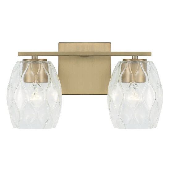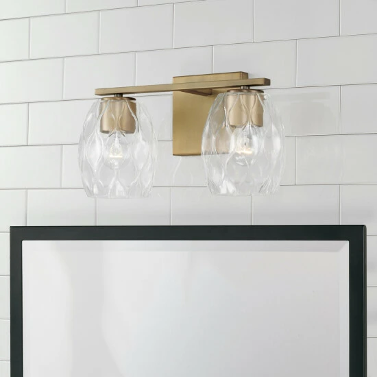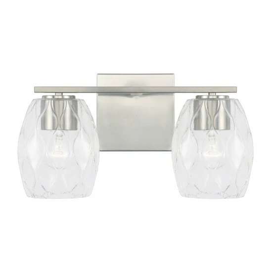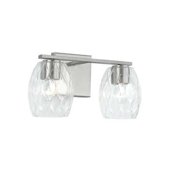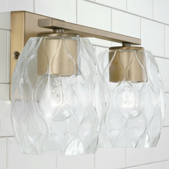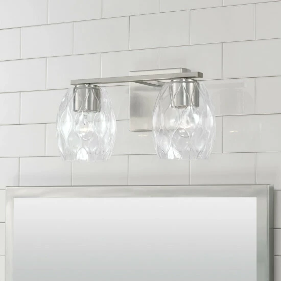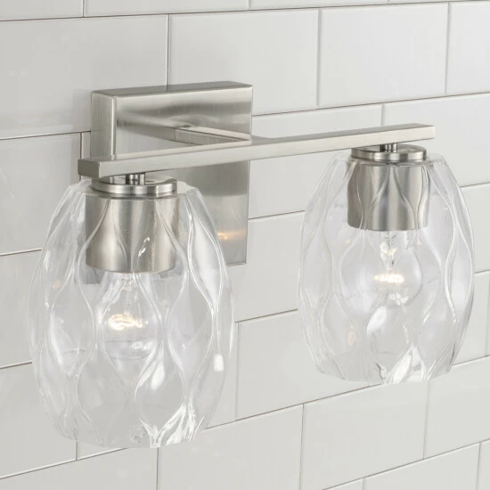 Simple shapes create a stunning statement with the Lucas 2-Light Vanity.Β The finishes paired with the wavy, embossed pattern in the glass adds subtle dimension with intriguing illumination.Β Also available in a 3-Light or 4-Light.