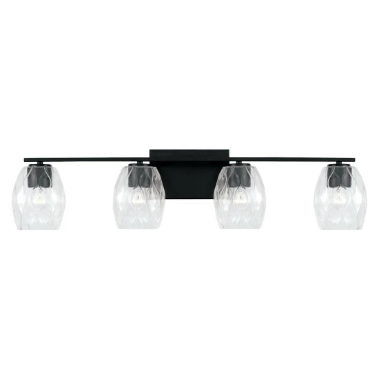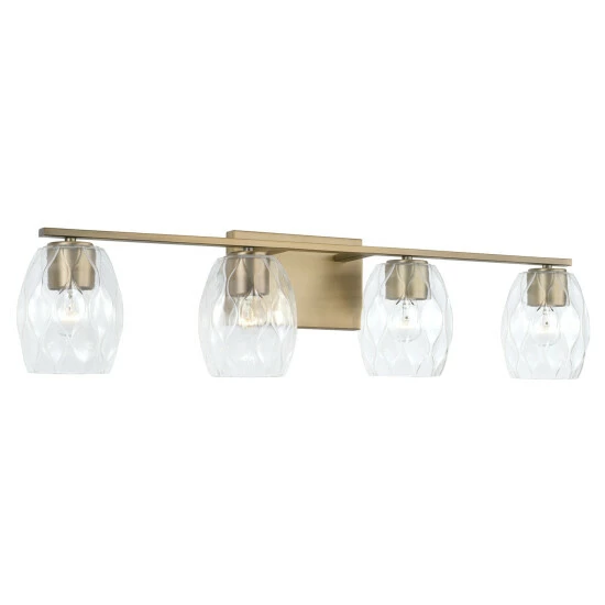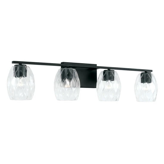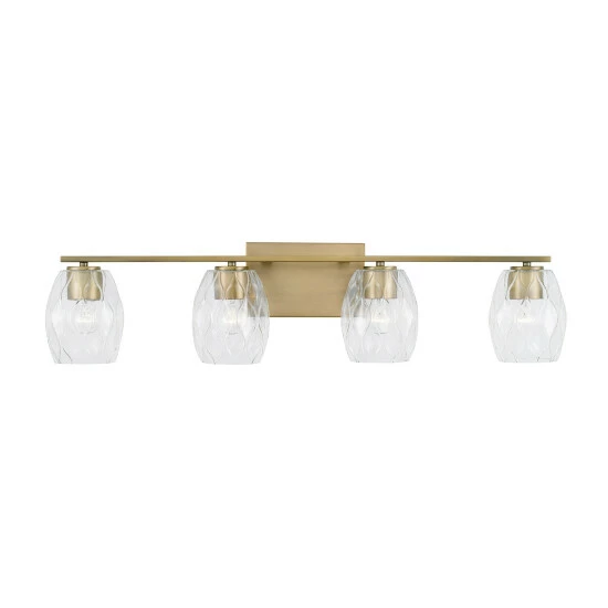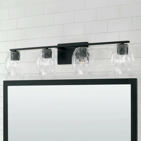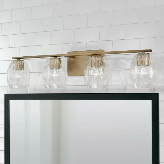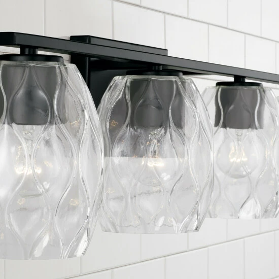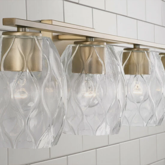 Simple shapes create a stunning statement with the Lucas 4-Light Vanity.Β The finishes paired with the wavy, embossed pattern in the glass adds subtle dimension with intriguing illumination.Β Also available in a 2-Light or 3-Light.