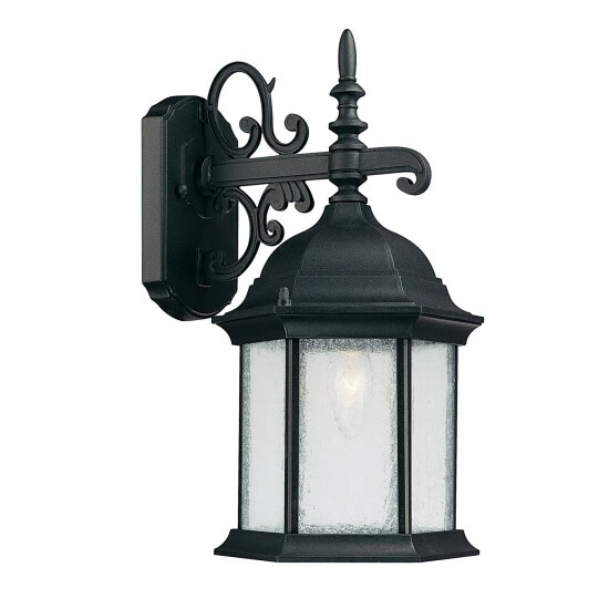 This Main Street collection 1-light outdoor wall lantern features a black finish that complements many classic and traditional outdoor decors. The clean lines and classic design of the cast aluminum frame add interest while the seeded glass panels allow the light to bounce giving your outdoor decor a whole new look.