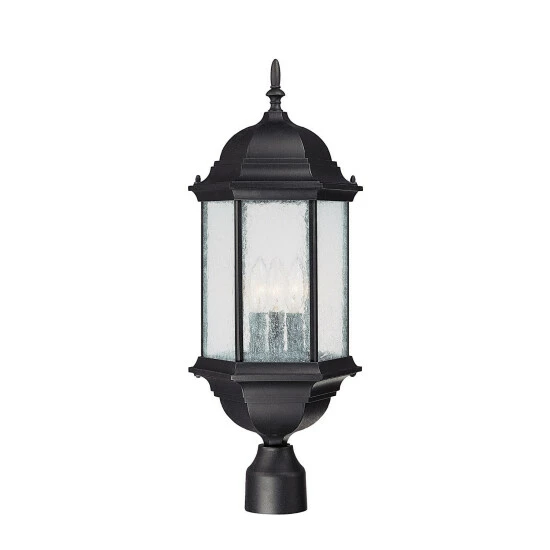 This Main Street collection 3-light outdoor post lantern features a black finish that complements many classic and traditional outdoor decors. The clean lines and classic design of the cast aluminum frame add interest while the seeded glass panels allow the light to bounce giving your outdoor decor a whole new look.