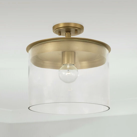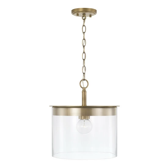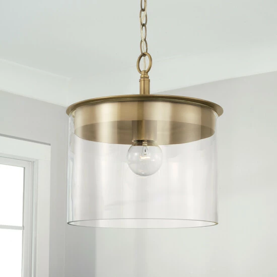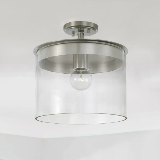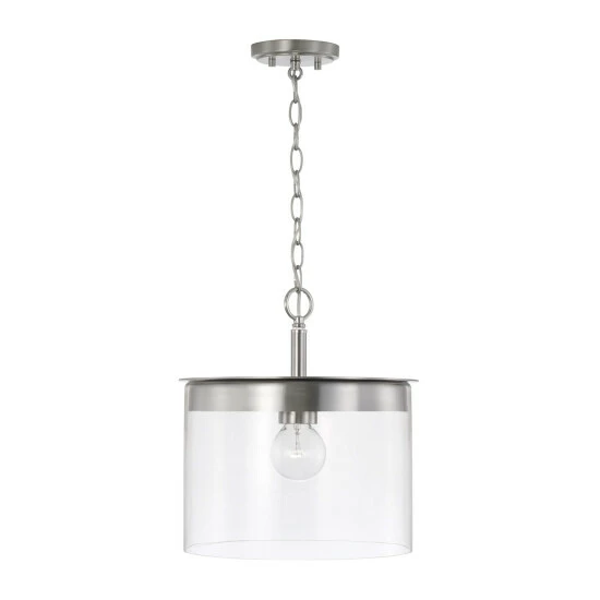 - Details: Can be used as a pendant or semi-flush. Decorative metal cap sits inside clear glass. Available in three finishes for maximum versatility.