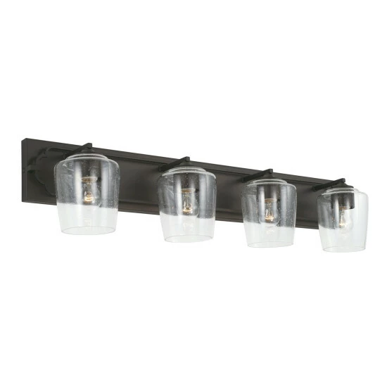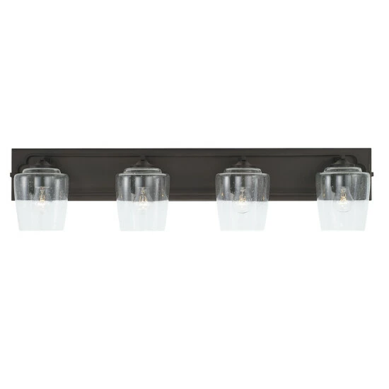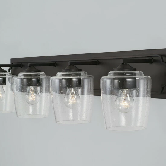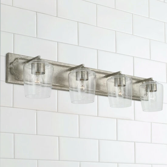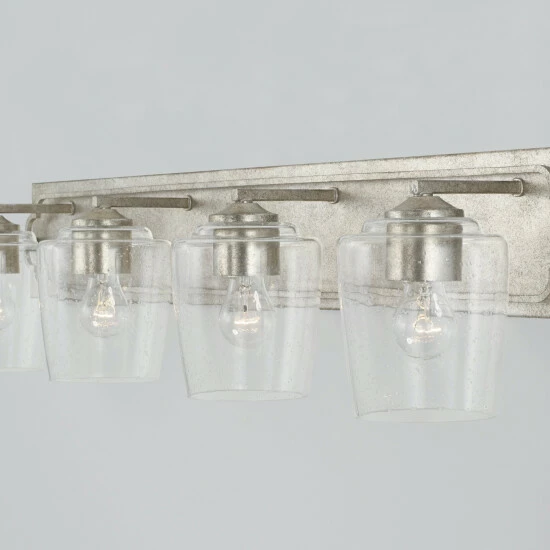 The bold backplate of the Merrick collection 4-light vanity anchors the simple, sophisticated quatrefoil-inspired frame. The finish adds a touch of elegance to the visual character of the seeded glass shades.