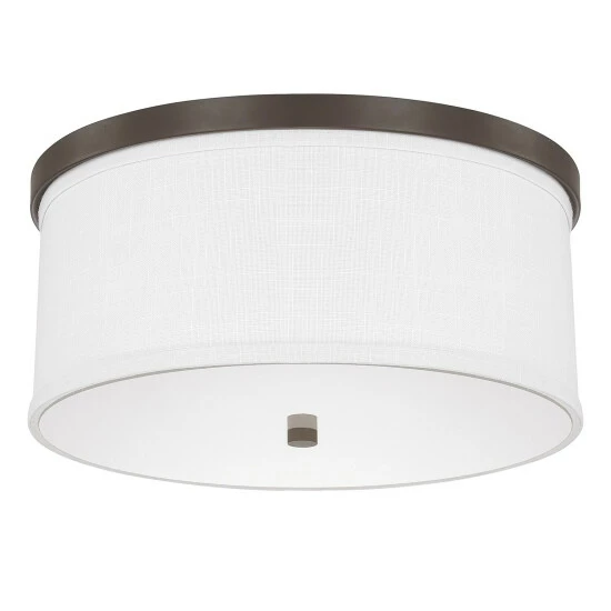This Midtown collection 3-light flush mount fixture features a beautiful burnished bronze finish that will complement many classic and traditional decors throughout your home. The clean lines of the steel frame add interest while the combination of the decorative fabric shade and frosted glass diffuser softens the light creating an inviting atmosphere for many spaces. Great for ambient lighting in a modern or minimalistic space, the Midtown ceiling fixture keeps it sleek and simple. A white decorative fabric shade trimmed in burnished bronze houses three lamps, their glow softened by frosted glass.