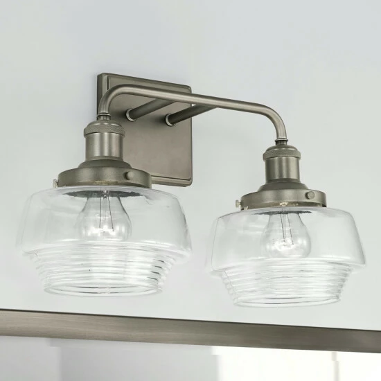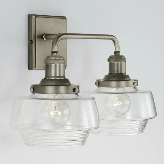 - Applications: Rated for damp locations, perfect for bathrooms and powder rooms. Historical accents about in this industrial themed fixture with clear schoolhouse shades.