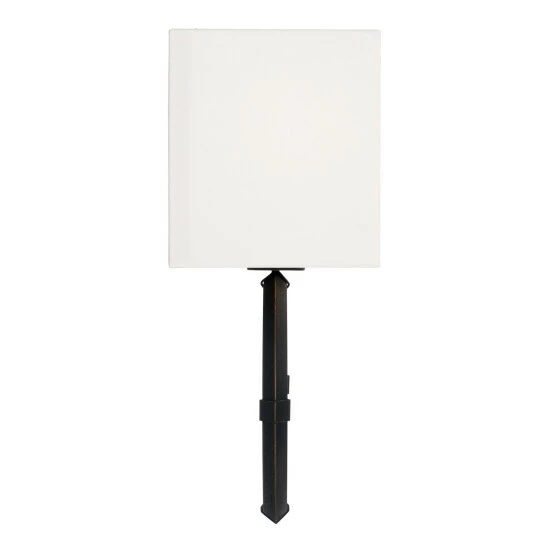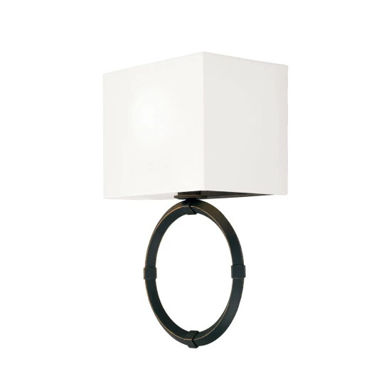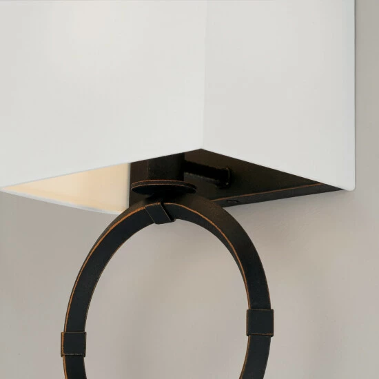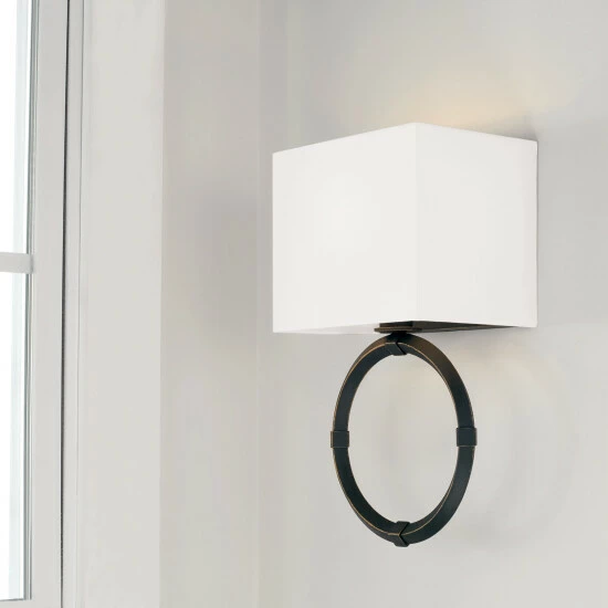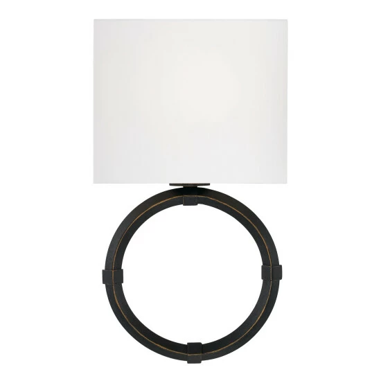 Tailored and timeless, the Ogden sconce brings a modern look to turn-of-the-century style. The Brushed Black Iron finish adds visual texture, and the gold highlights accent the bias angle of the ring.