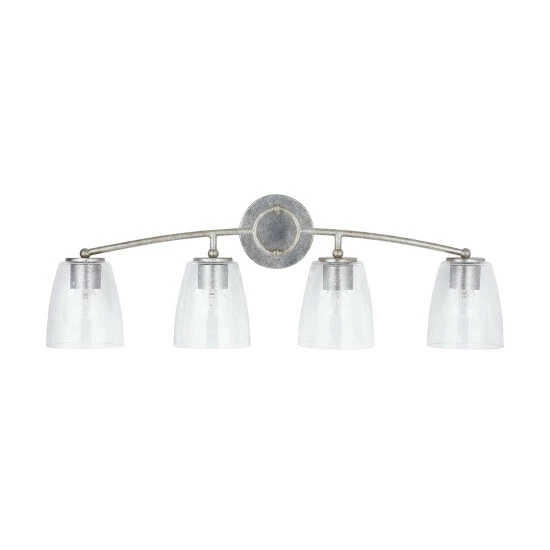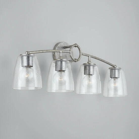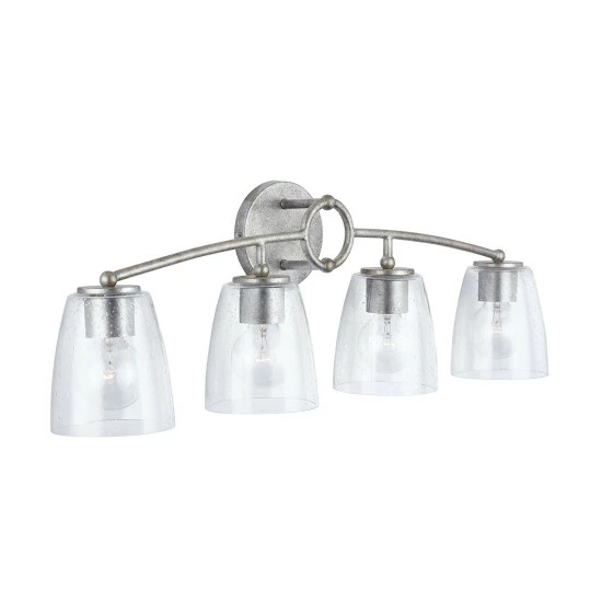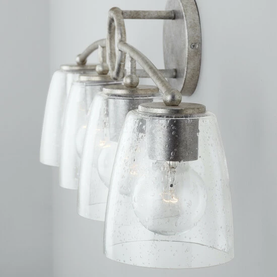 This seeded glass vanity features prominent ring details with a curved frame. The Antique Silver finish adds a layer of sophistication to the transitional style. Available as a 2-light, 3-light or 4-light vanity.