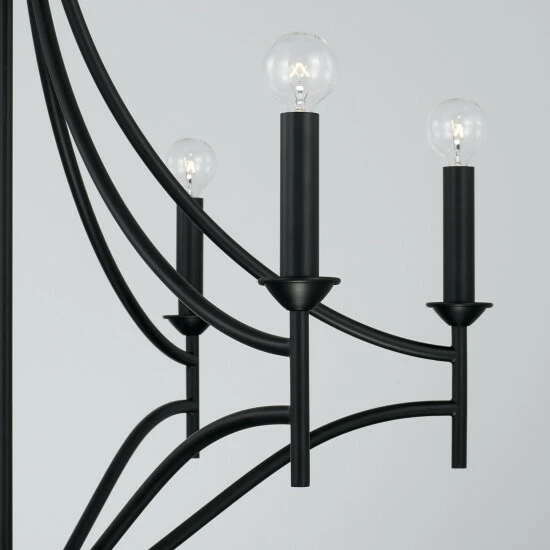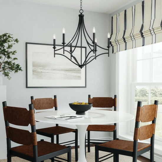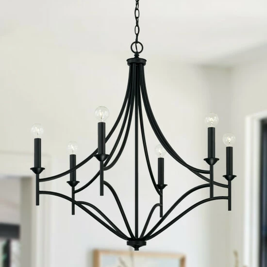 The sharp lines and artistic arches of the Peyton collection 6-light chandelier are timelessly transitional. The muted tone of the Matte Black finish allows the silhouette to take center stage.