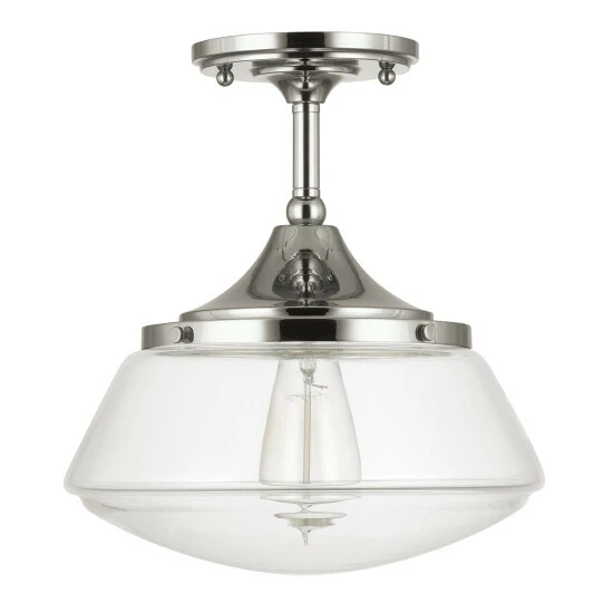 Bring your decor to the next level with this retro light fixture. The polished nickel is well contrasted with the clear glass shade on this flush mount light fixture. The single bulb is framed beautifully in a circular shade with a curved head. Hang this piece above a dining room table or as a centerpiece in a bedroom or living room.