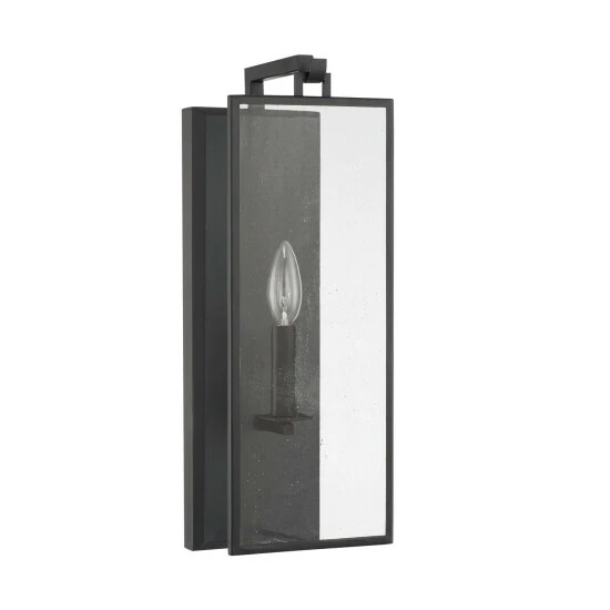 This Rylann collection 1-light wall sconce features a beautiful matte black finish that will complement many classic and traditional decors throughout your home. The antique glass panel provides a unique look to the light completing this simple yet functional design.