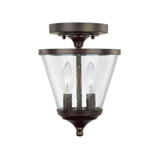 This Stanton collection 2-light pendant features a burnished bronze finish that will compliment many traditional and classic decors. The clear seeded glass adds interest. This piece Includes all hardware needed to covert it to a semi flush fixture. 60 inches of chain and 96 inches of wire included. Dimensions: 11 inches high x 7 inch diameter.