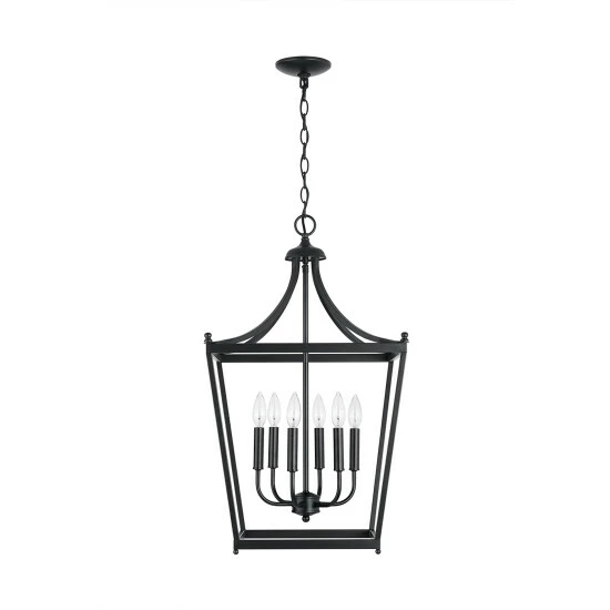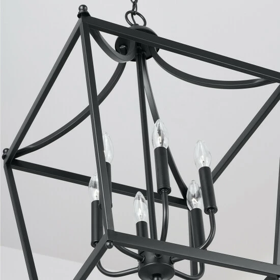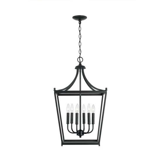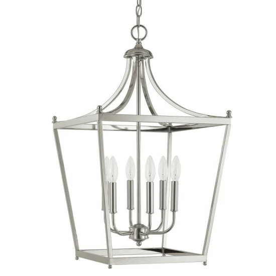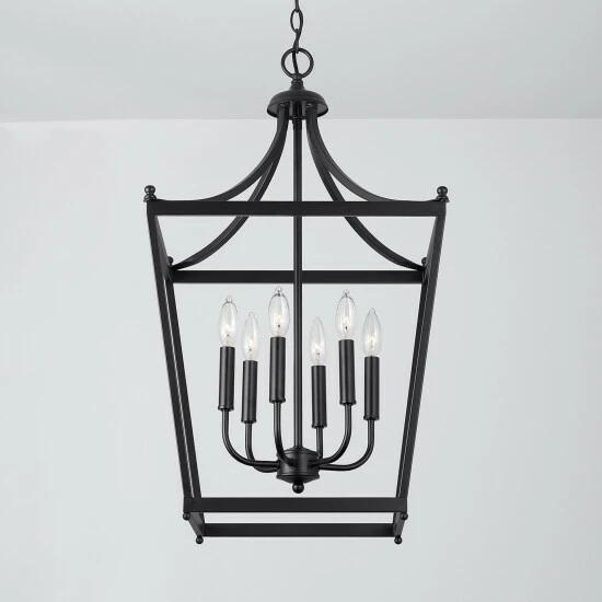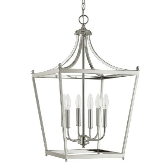 This Stanton collection 6-light pendant features a polished nickel or matte black finish that will complement many traditional decors. The metal framework around the light cluster adds interest and completes the look of this piece.