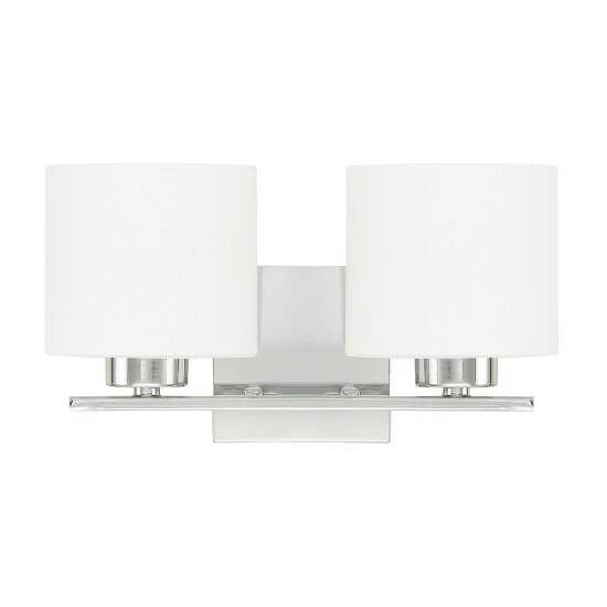 This Steele collection 2-light bath/vanity fixture features a chrome finish that will complement many modern, contemporary, and transitional decors throughout your home. The clean lines of the steel frame add interest while the soft white glass shades soften the light completing this simple yet functional design. Bathe your space in chic, sophisticated style with the Steele vanity in chrome. Soft white glass shades cast a diffused glow over and around your mirror and sink.