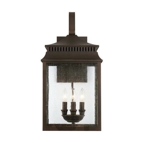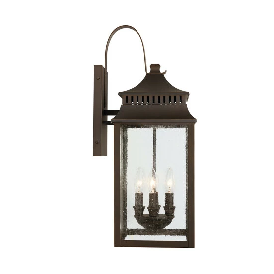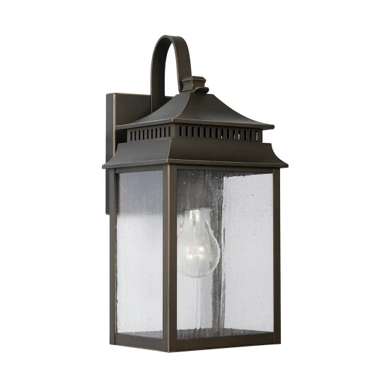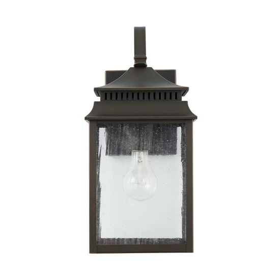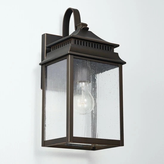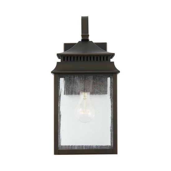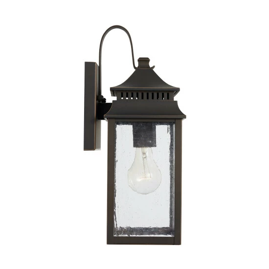 The pagoda-shaped lanterns in this outdoor collection are finished in Oiled Bronze, which feels beautifully aged with time. Each piece is crafted out of aluminum and finished with a UV-inhibitor protective powder-coat. Featuring antiqued rain glass and clean lines, these fixtures look great in all elements.
