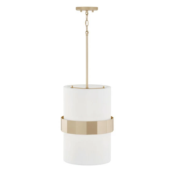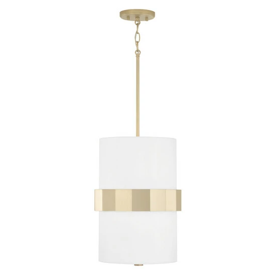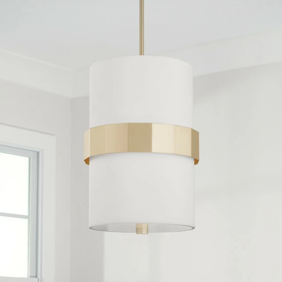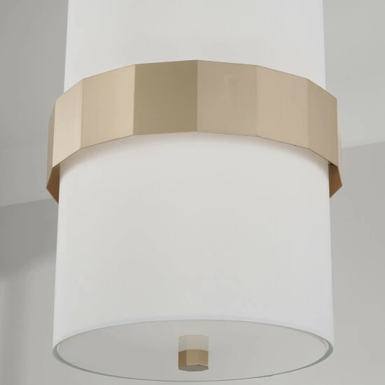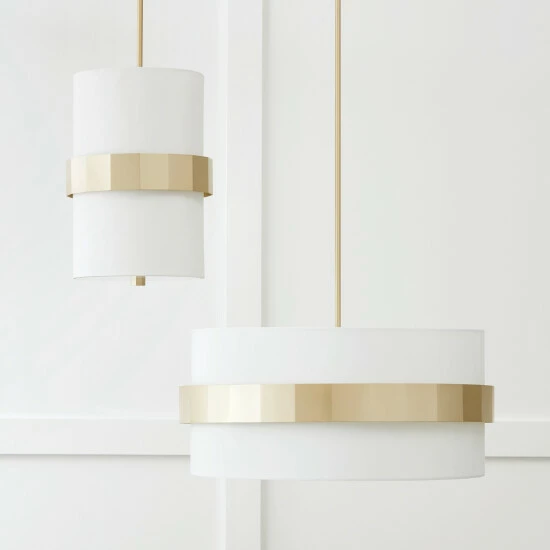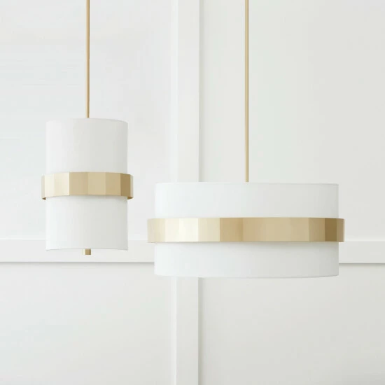 Sophisticated and stunning, the Sutton Small Pendant puts a tailored touch onΒ a simple form. The champagne sheen of Soft Gold faceted bandΒ complements the crisp, white fabric shade for an elevated elegance.