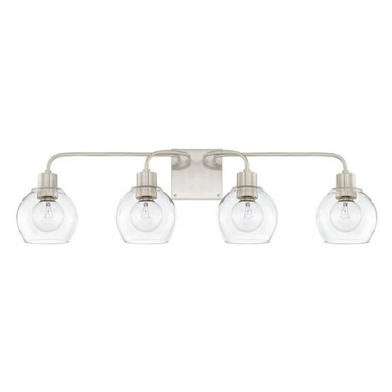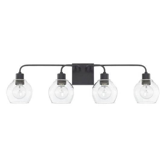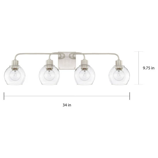 This delightful four-light bath vanity light fixture arrives in your choice of a brushed nickel, bronze, or matte black finish that will complement many transitional and traditional spaces. The clean lines of its steel frame add interest, while the clear glass shades provide uninterrupted illumination.