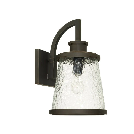 This Tory collection 1-light outdoor wall lantern features an oiled bronze finish that complements many classic and traditional outdoor decors. The outdoor wall lantern from the Tory Collection will electrify the porch, patio or deck with updated transitional style. This exterior fixture is defined by distinctive curves, textured glass and tapered shades. The Tory outdoor lights are crafted of durable, non-corrosive materials and designed to withstand harsh weather. These fixtures features a 5 year warranty against rust and fading.