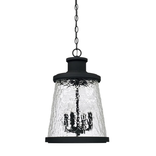 This Tory collection 4-light outdoor hanging lantern features a black finish that complements many classic and traditional outdoor decors. This hanging lantern from the Tory Collection will electrify the porch, patio or deck with updated transitional style. This exterior fixture is defined by distinctive curves, textured glass and tapered shades. The Tory outdoor lights are crafted of durable, non-corrosive materials and designed to withstand harsh weather. These fixtures features a 5 year warranty against rust and fading.