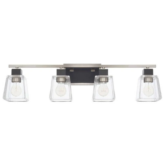 This Tux collection 4-light bath/vanity fixture features a beautifully hand painted black tie finish that will complement many classic and traditional decors throughout your home. The clean lines of the frame add interest while the clear glass shades provide uninterrupted light to many spaces.