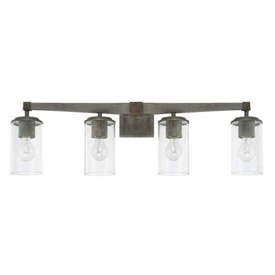 This Zac collection 4-light bath/vanity fixture features a beautifully hand painted urban grey finish that will complement many industrial decors throughout your home. The clean lines of the frame add interest while the clear seeded glass shades allow the light to bounce giving a unique look to the light.